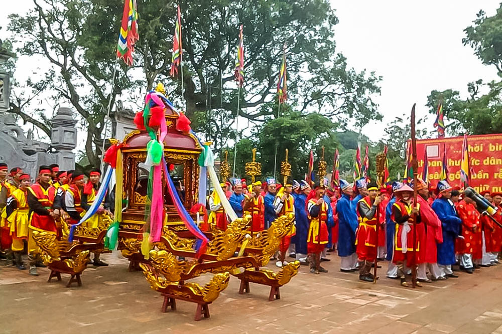 Dóng tức là nơi tổ chức vật, rước thánh vào dóng nghĩa là rước kiệu Thánh Ông từ đền vào nơi tổ chức vật. Lễ vật dâng thánh là lễ chay, gồm mấy phẩm oản, vài bẹ chuối, một nậm trà (thay cho rượu). Một cụ già tay cầm gươm đi giật lùi dẫn đầu cuộc rước, khi kiệu Thánh vào dóng thì làm lễ tế.